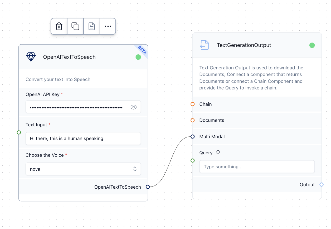 <figure><img src="https://3489179498-files.gitbook.io/~/files/v0/b/gitbook-x-prod.appspot.com/o/spaces%2FjlRjmrZThWiLNO9xTu9d%2Fuploads%2FsMaDEpYCtO8rAzvLwMul%2FScreenshot%202024-05-21%20at%205.37.43%E2%80%AFPM.png?alt=media&#x26;token=8d047ebf-ec9d-43fa-9dfc-f334265daeef" alt=""><figcaption><p>using the OpenAITextToSpeech to generate a voice speech</p></figcaption></figure>