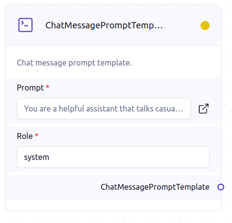 The Chat Message Prompt Template determines the role assigned as the input and links the component to the Chat Prompt Template as the output.&#x20;
