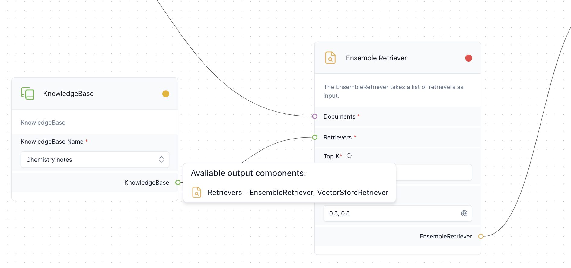 * **Ensemble Retriever Integration:** The screenshots below demonstrates how a Knowledge Base named "Chemistry Notes" can be connected to an Ensemble Retriever. This retriever can combine outputs from multiple retrieval models, such as the EnsembleRetriever and VectorStoreRetriever, to provide comprehensive and accurate results.