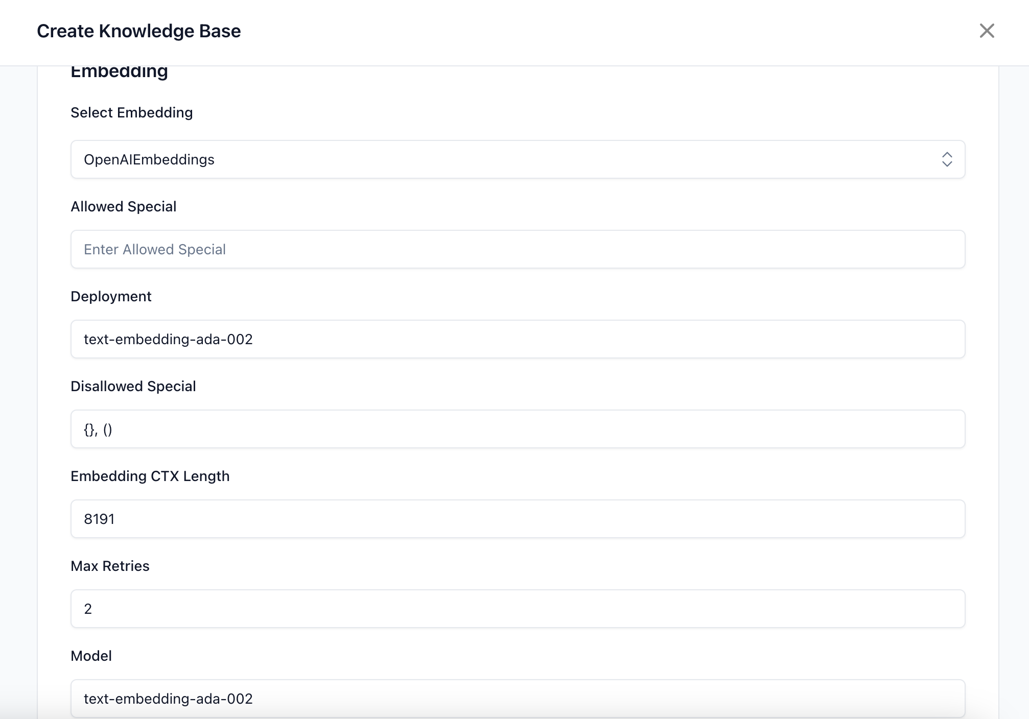 * **Embedding Details:** Choose the embedding method to represent your data in vector form. Embeddings transform your textual data into numerical vectors that can be easily processed by machine learning models.&#x20;