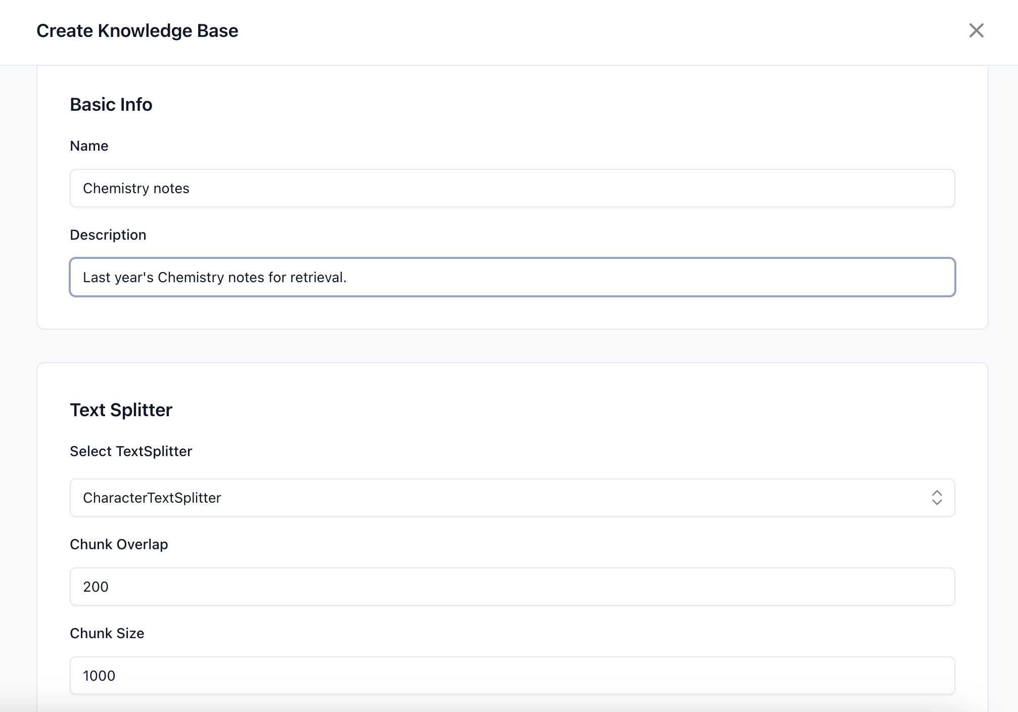 * **Name:** Enter a name for your Knowledge Base. This should be descriptive enough to identify the data it contains.