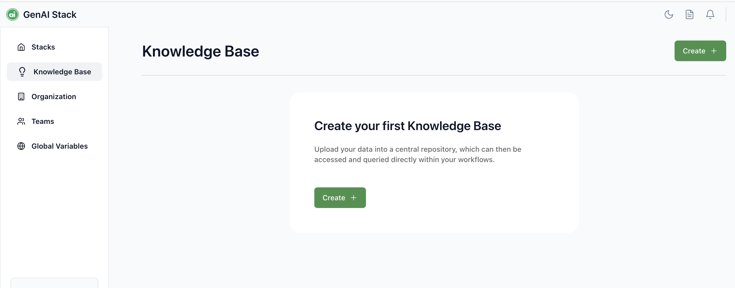 * Navigate to the "Knowledge Base" option on the main page of your GenAI Stack site.